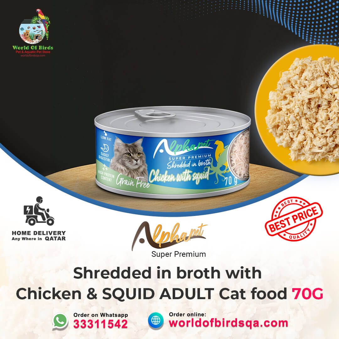 ALPHA PET SUPER PREMIUM DELUXE SHREDDED CHICKEN & SQUID IN BROTH – 70G CANNED CAT FOOD