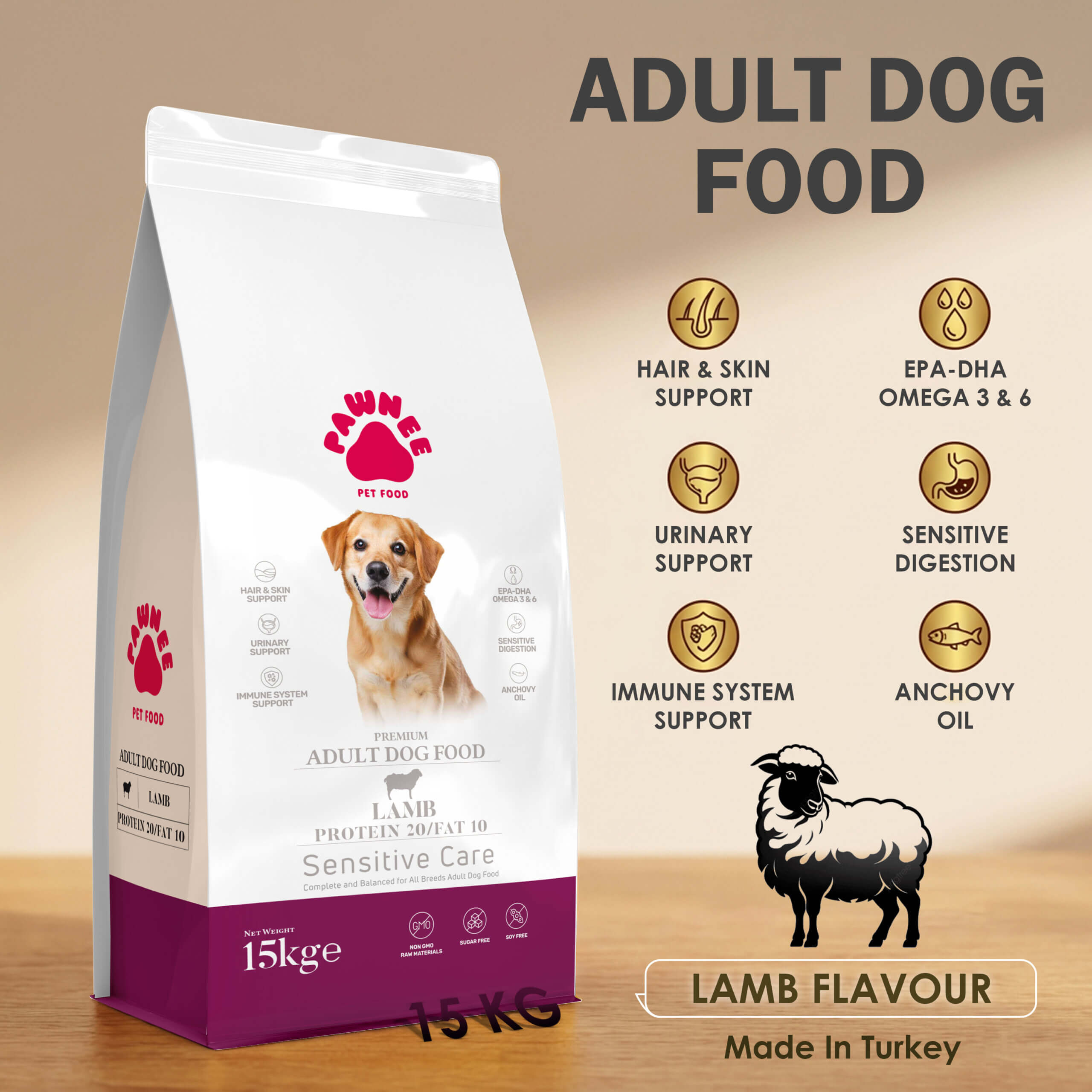 Pawnee Premium Adult Dog Food with Lamb – Sensitive Care, 15kg | Made in Turkey